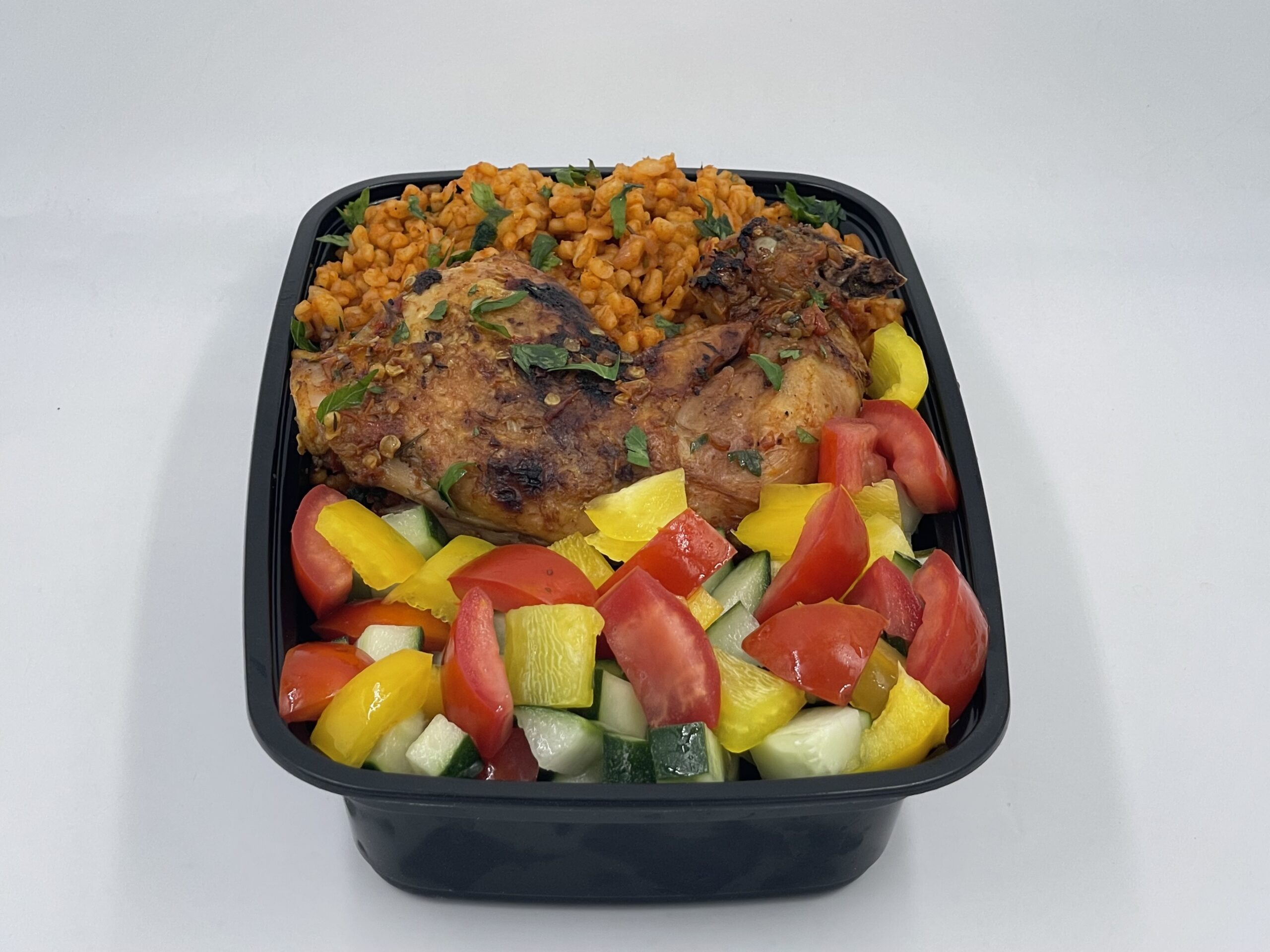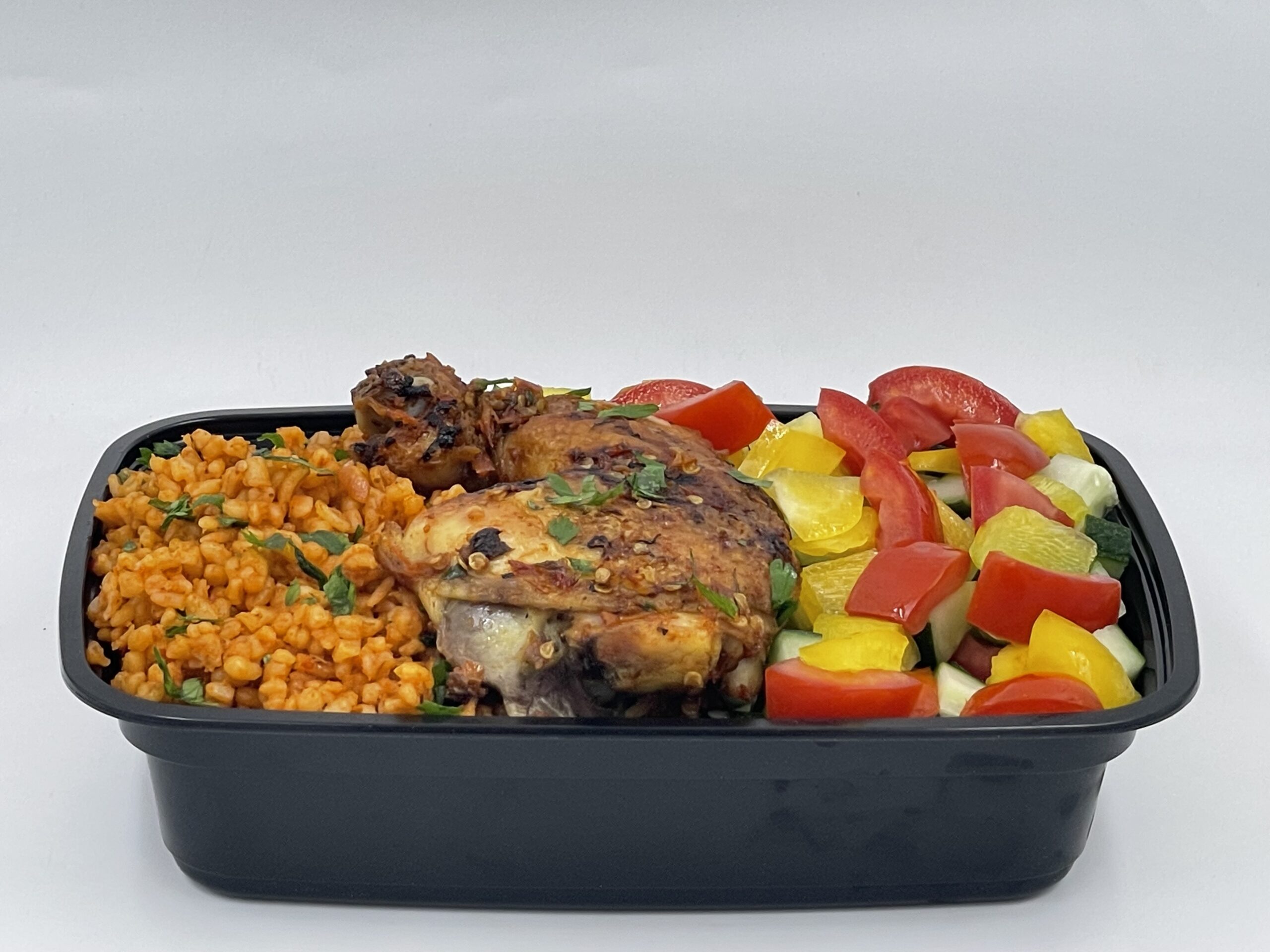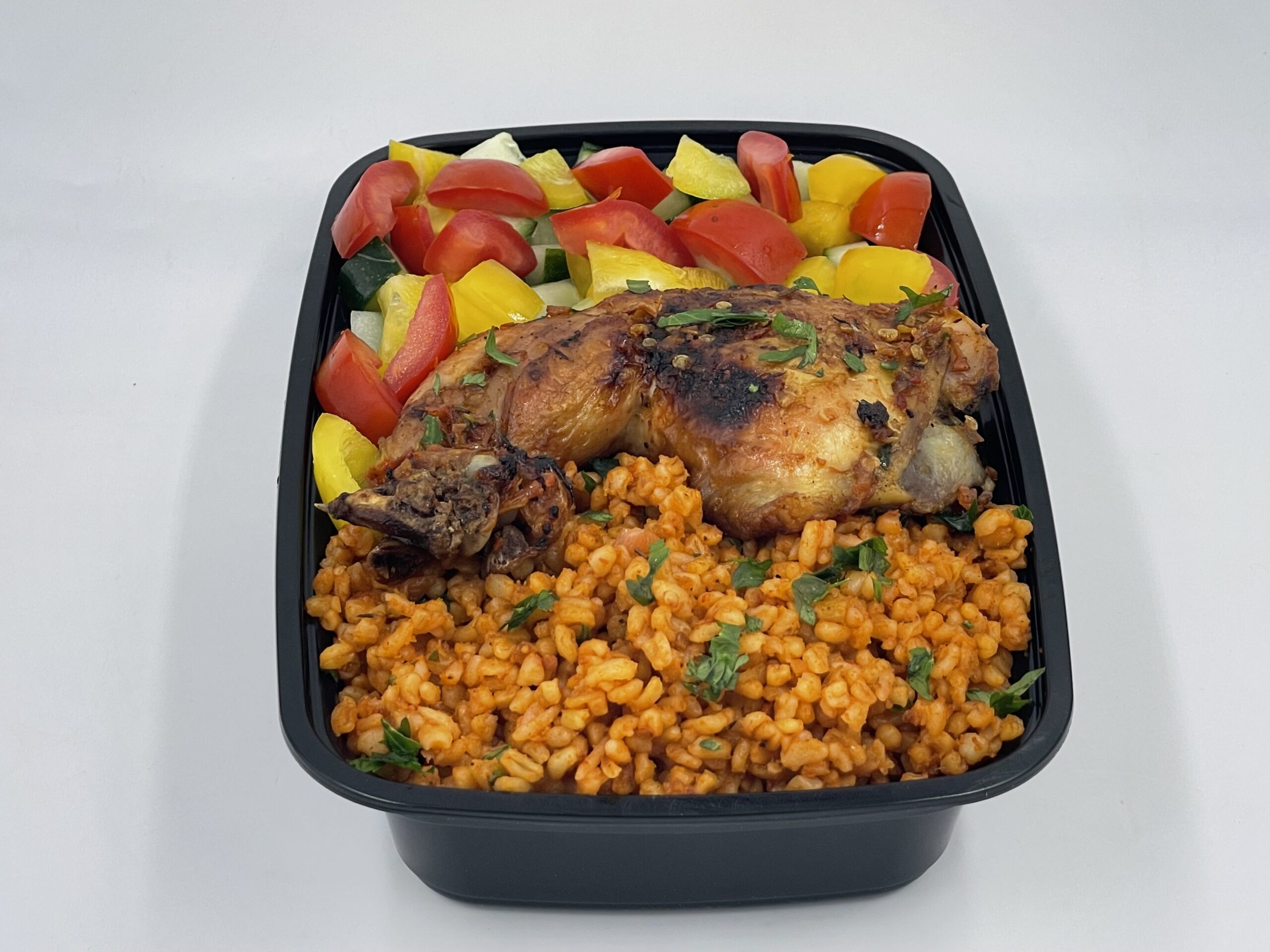 Bulgur, chicken lap, bell pepper, tomato sauce, cucumber.