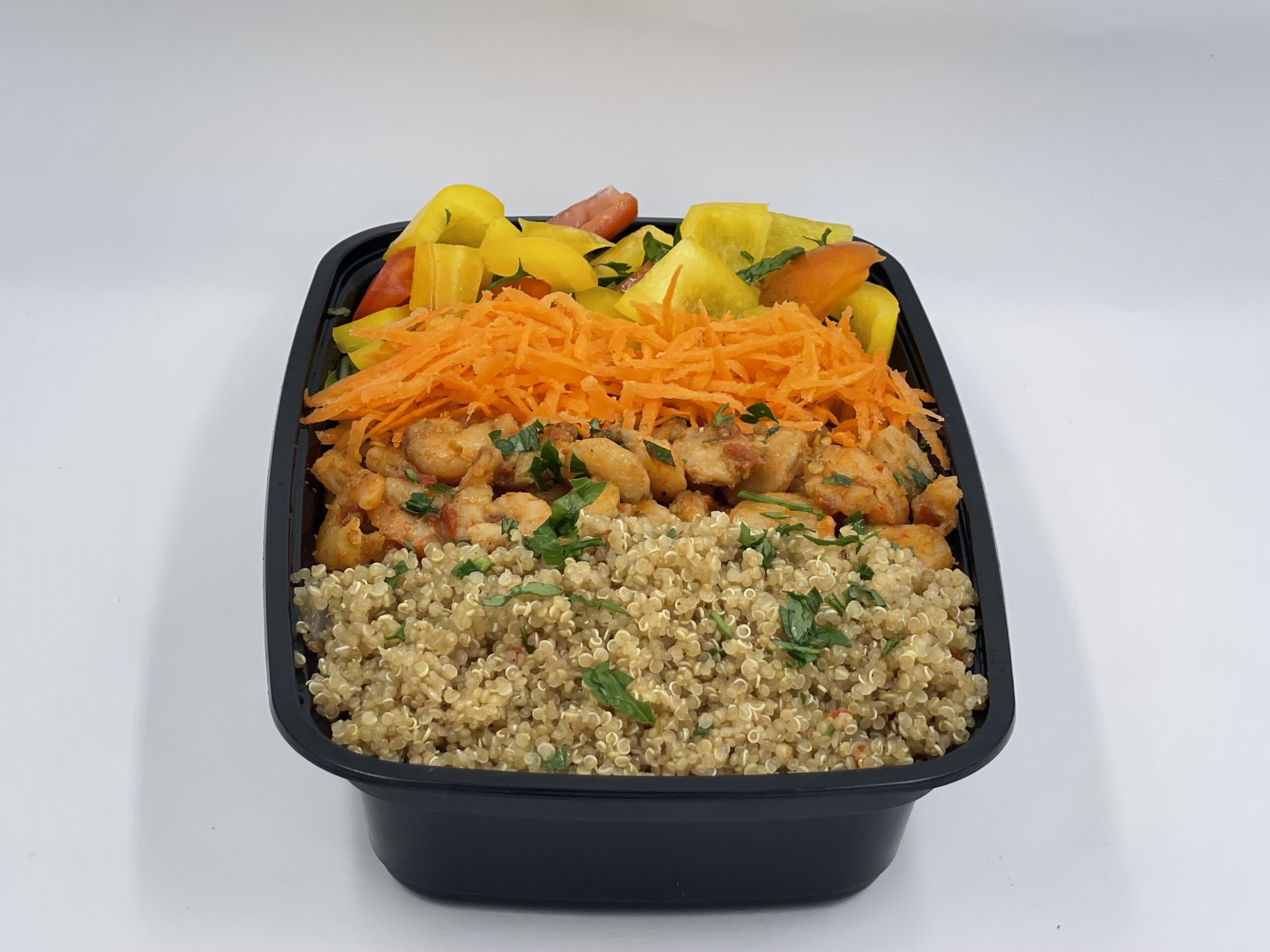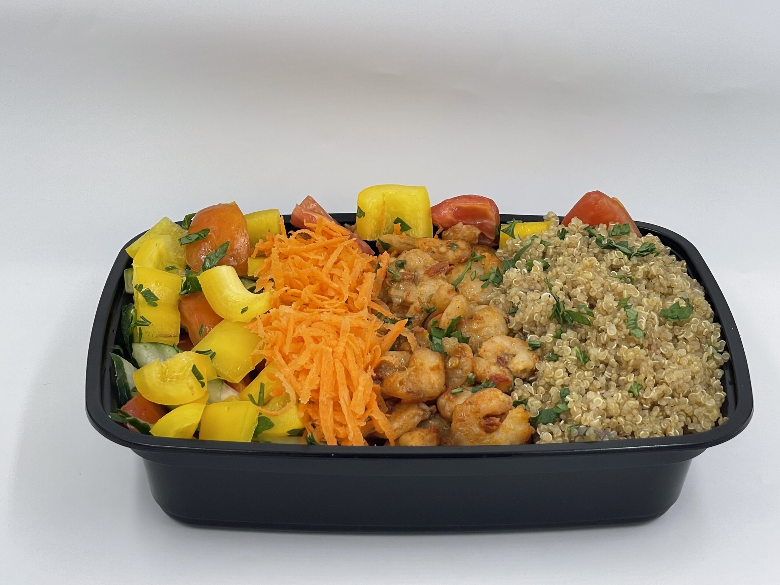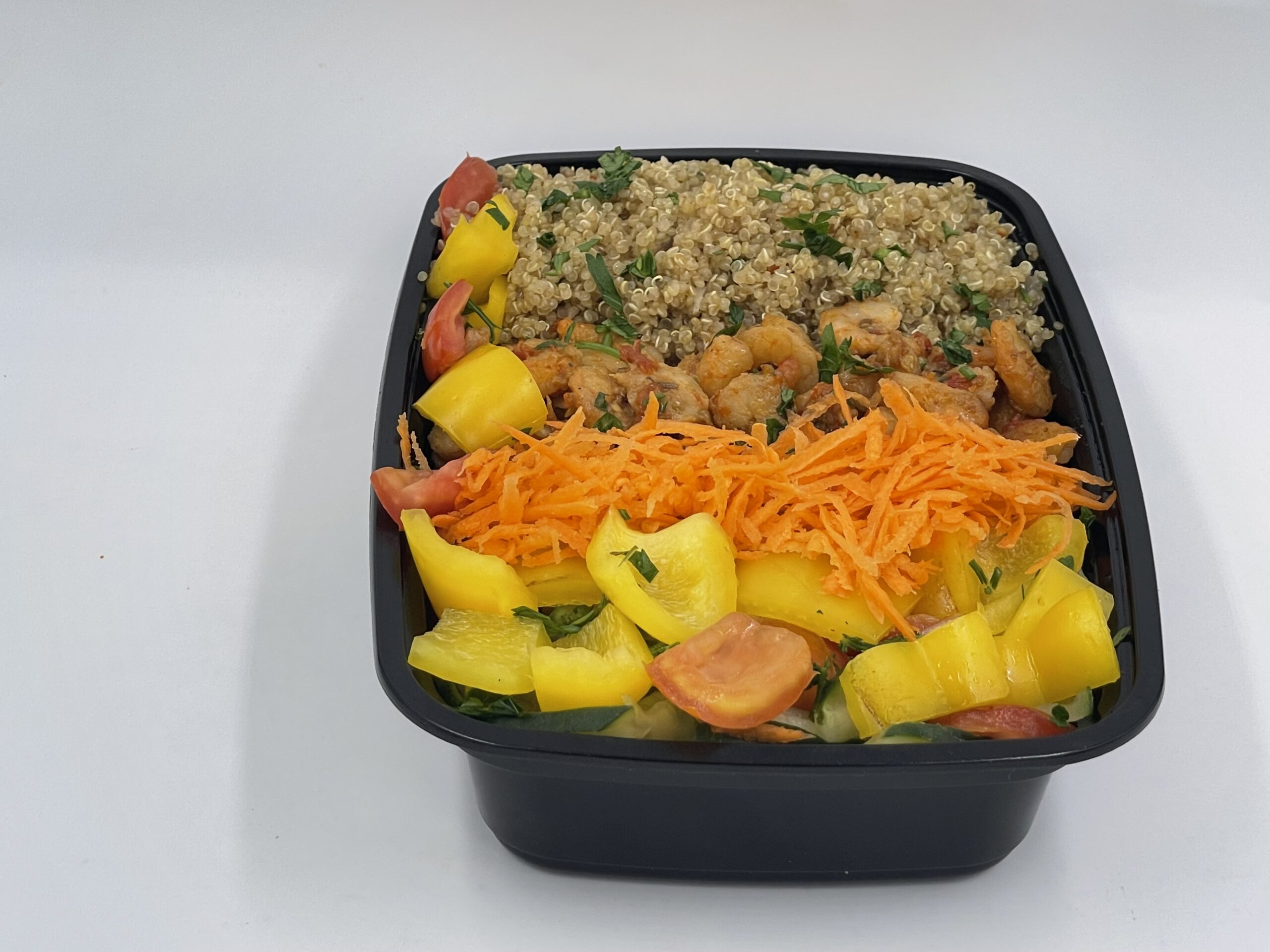 Stir-fry quinoa served with shrimps and seasonal vegetables